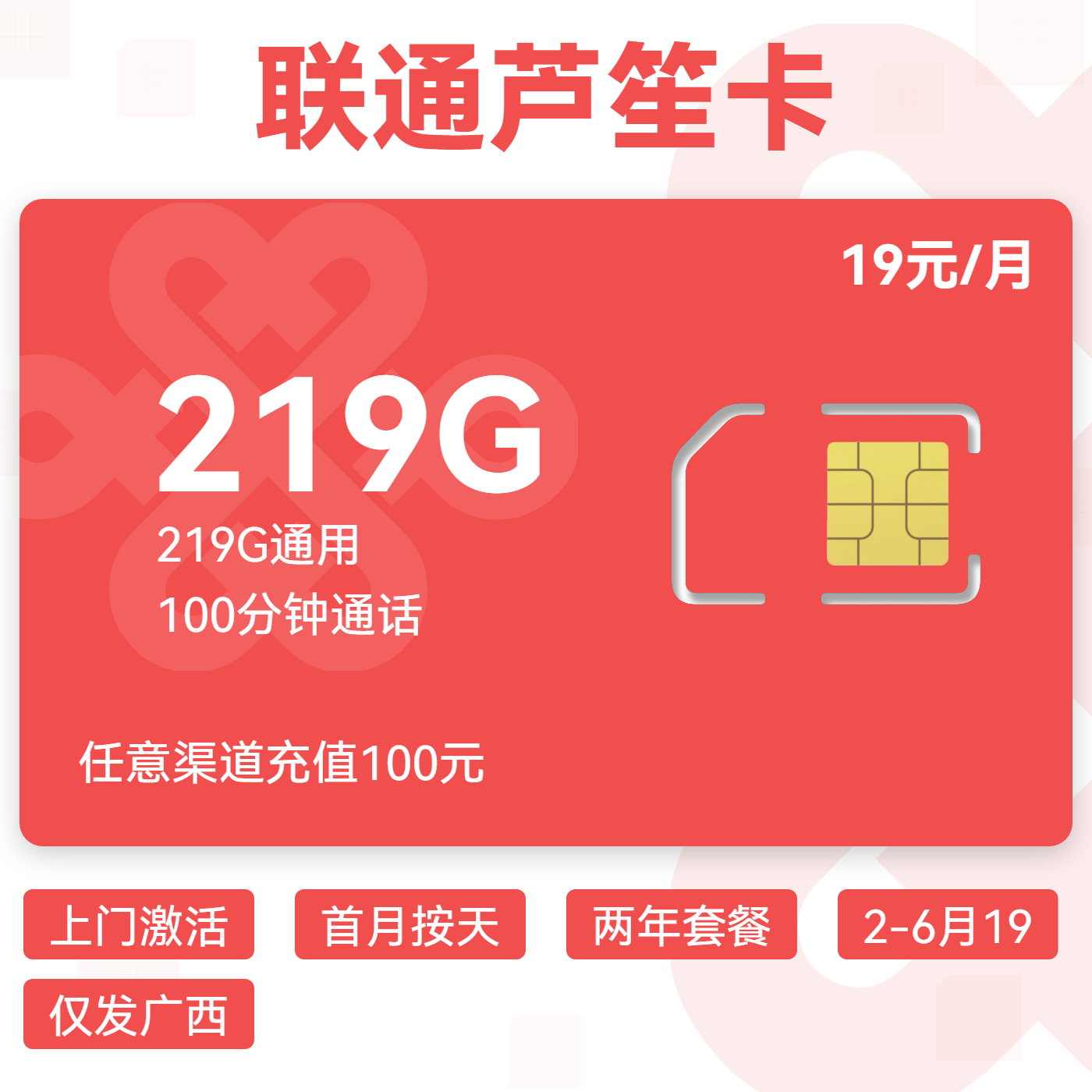上门激活首月按天两年套餐2-6月19仅发广西