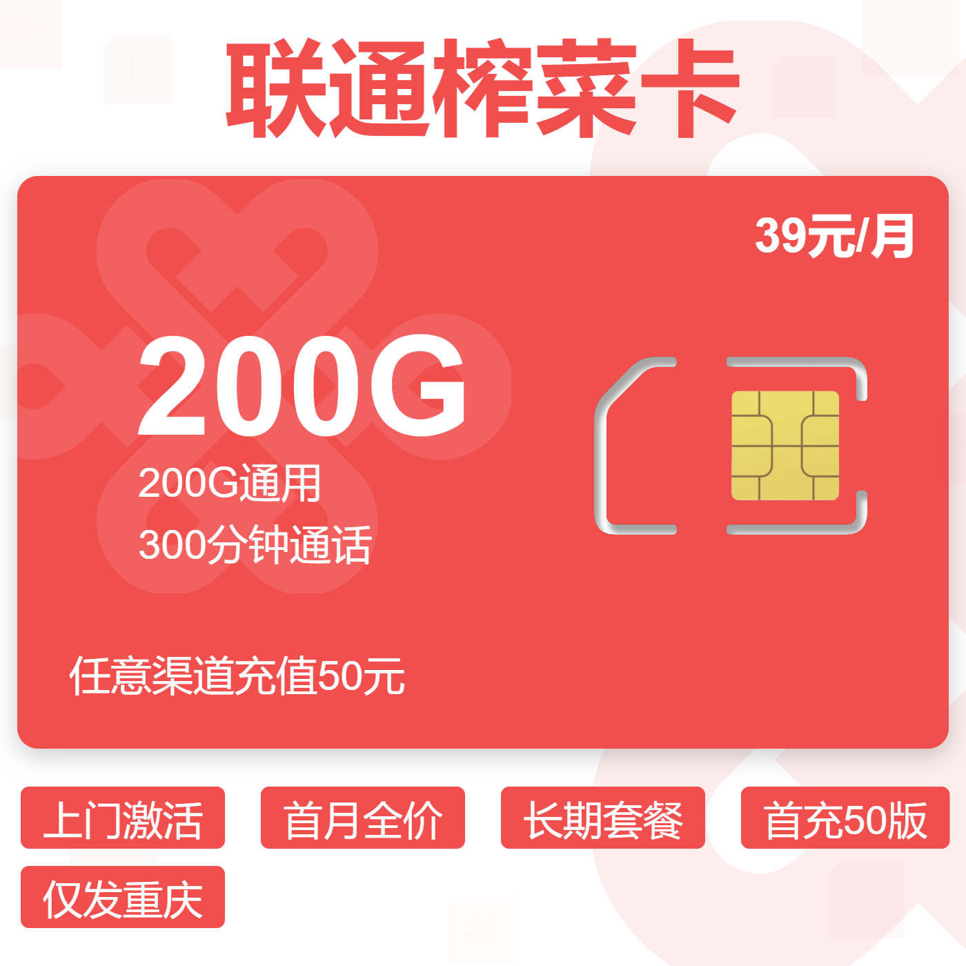上门激活首月全价长期套餐首充50版仅发重庆